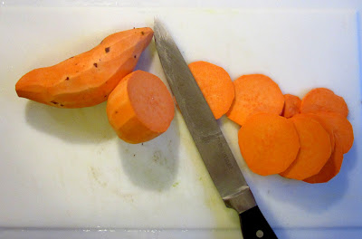 Meanwhile, slice up your peeled sweet potatoes about 1/4 of an inch thick, and add to the boiling water. Boil for about 5-10 minutes, or until slightly tender.